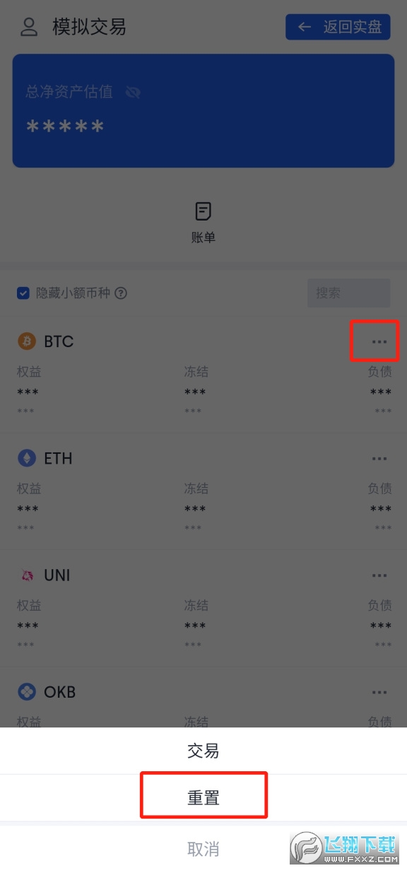 04 在模擬盤中,會有固定數(shù)量和金額的虛擬交易資金,當交易完成后不存在掛單或持倉時,即可在模擬交易資產(chǎn)頁面中點擊重置進行模擬資產(chǎn)的重置。