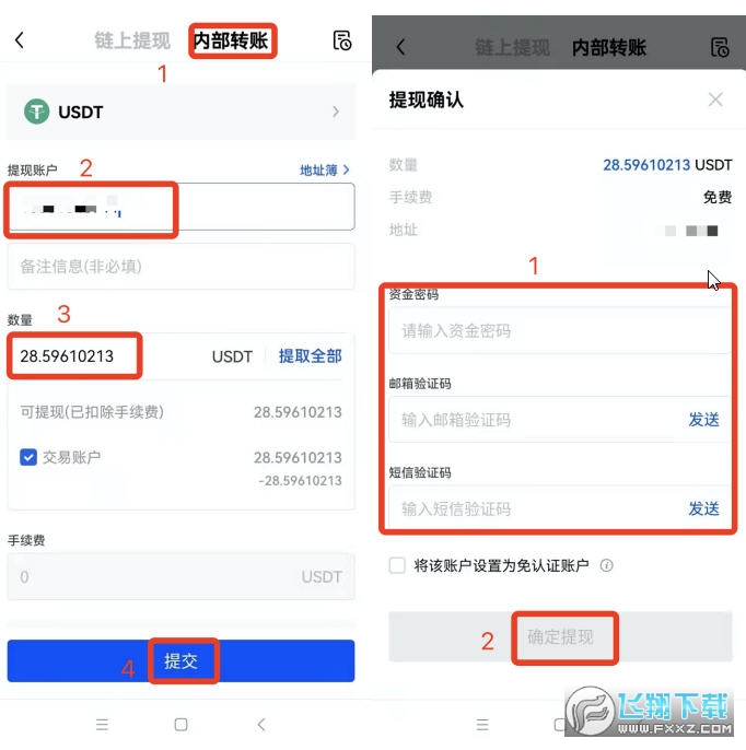 2.內(nèi)部轉(zhuǎn)賬:打開(kāi)歐易APP,選擇【資產(chǎn)】欄 ―【提現(xiàn)】―選擇幣種【USDT】―選擇【內(nèi)部轉(zhuǎn)賬】―輸入【提現(xiàn)賬戶】―【數(shù)量】―【提交】―按要求獲取并輸入相關(guān)密碼/驗(yàn)證碼―【確定提現(xiàn)】,完成操作。