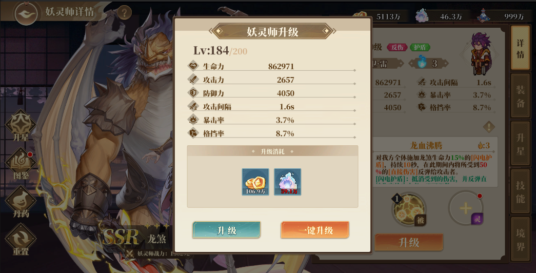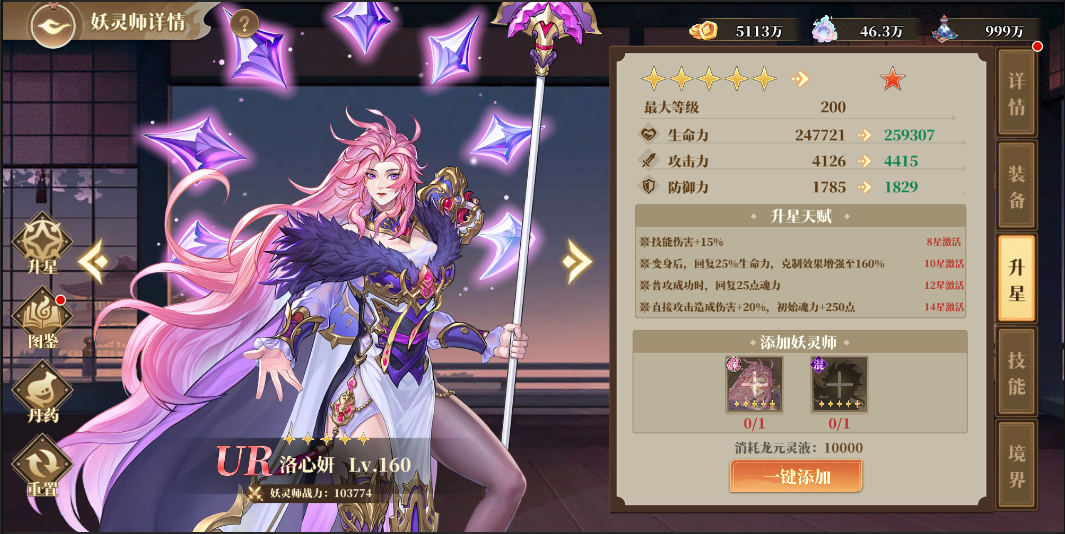 妖靈師可以通過消耗升級材料(妖晶幣、龍元靈液)提升等級,而升級可以提升面板屬性,當達到等級上限時可以通過消耗妖晶幣、龍元靈液和九轉丹進階等級上限。不過前期資源有限,還是盡量避免將養(yǎng)成材料分散給太多角色,練好一隊主力隊伍能過主線才是最重要的。?